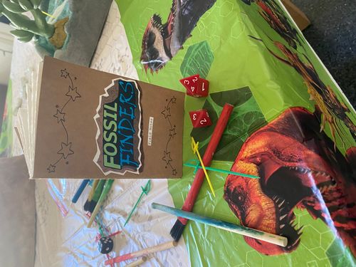 Once everyone finishes digging, players construct their dinosaurs and roll dice to see who wins. The player who finished first gets a higher-valued die than the others.